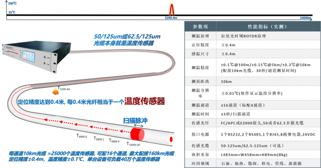 在10km光缆(环境温度全程25℃)的任何位置,比如5299.4米处,对0.8m范围的光缆(对应于感温尺寸±0.4m)全部加热至100℃,3秒内,系统可准确定位至±0.4m的精度,且准确测得光缆实际感知到的温度100℃;假如只加热0.2m范围的光缆,光缆的实际温度将因系统的最小感温度尺寸的限制,实际感温尺寸将被系统最小感温尺寸强行平均,实际测得此位置的温度约为45℃(不能完全还原光缆实际感受到的100℃,但此位置仍然能够准确预警温度突变异常,并准确定位±0.4m的精度);假如仅仅只加热0.05m甚至更小的区域,则本系统无法准确的还原温度和准确定位加热位置(同时受限于感温最小尺寸与峰峰温度噪声,一般认为温度加热点与周边温度平均值的差值,需要大于温度噪声峰峰的5倍以上,才可被视为有一定可信度的预警与定位)。